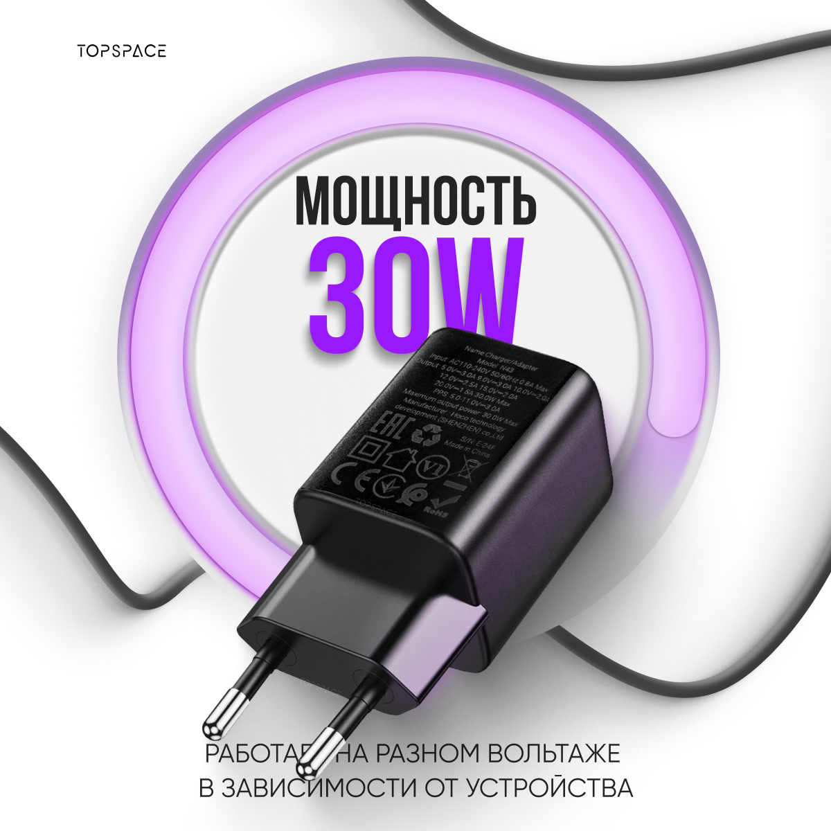 Зарядка черная с кабелем для колонки Алиса Станция Мини 3 (блок 30W + шнур Type-C / Type-C до 60W 1 метр) информация: