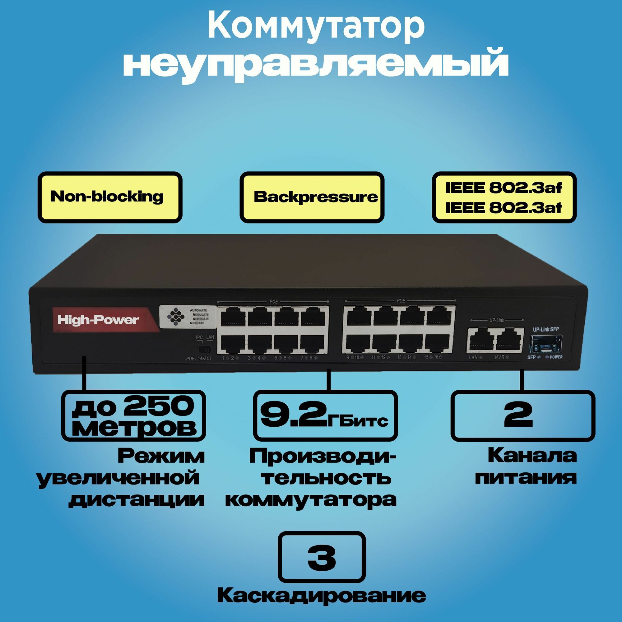 Коммутатор POE 16хPOE(100Мбит) + 2хEthernet(1ГБит-uplink) + 1хОпт. SFP(1ГБит-uplink) 300Вт Черный информация: