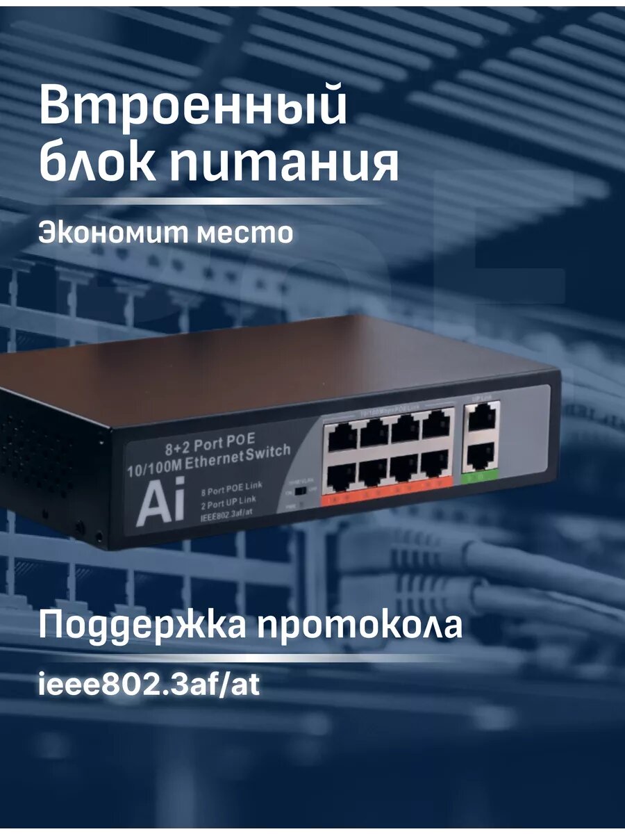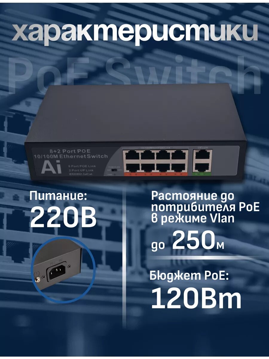 10 цен на Коммутатор неуправляемый (свитч) 8 PoE+2 Uplink, черный