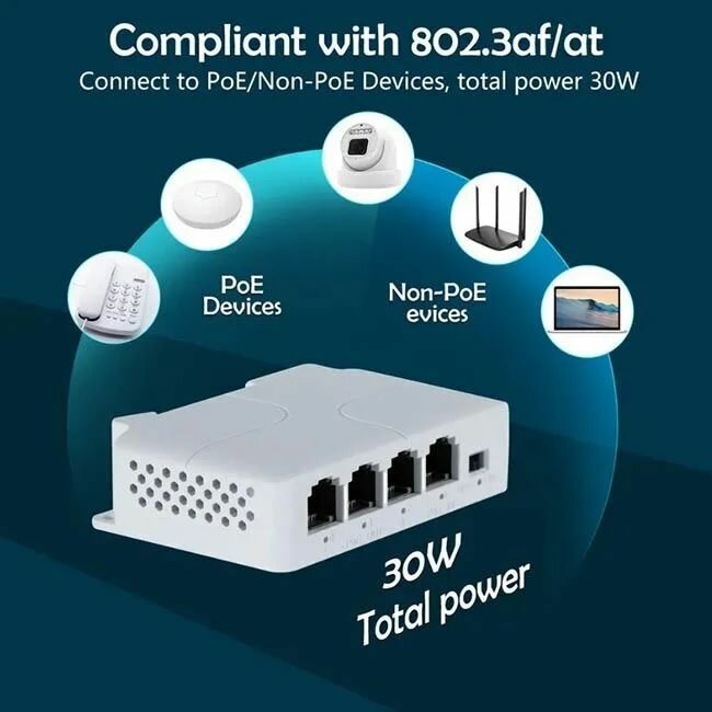 10 цен на Коммутатор Gadinan PoE Extender, 4 LAN-порта, 1 WAN-порт, 30Вт, 100Мбит