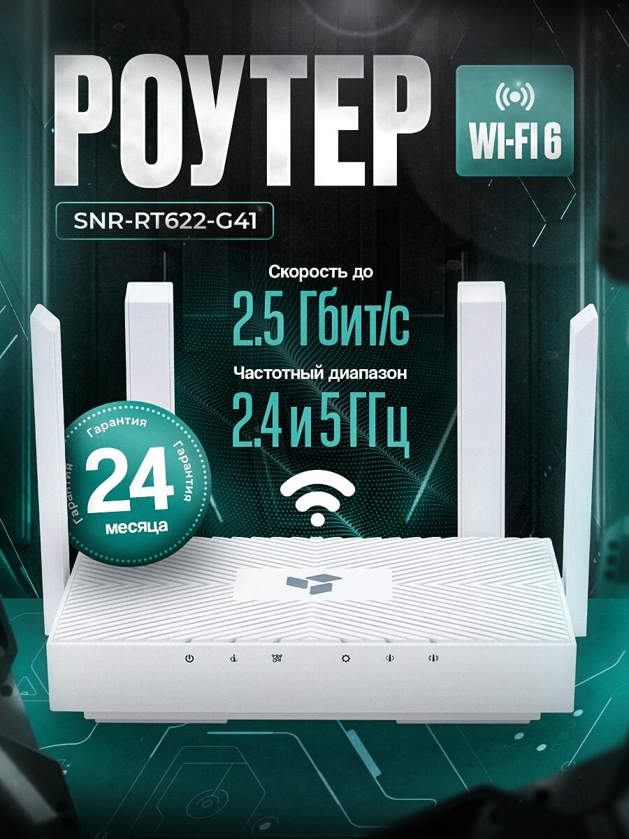 Роутер двухдиапазонный SNR-RT622-G41 2.4 и 5ГГц, Маршрутизатор wifi 2.5 Гбит/с, Поддержка технологий Wi-fi 6, MU-MIMO, Mesh, FireWall, IPv6, OFDMA информация: