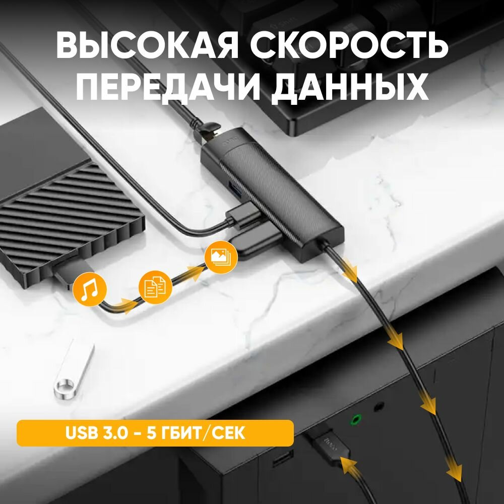 10 цен на Сетевой Ethernet адаптер переходник HOCO HB42 USB-A - LAN Rj45 + USB 3.0*3, серый