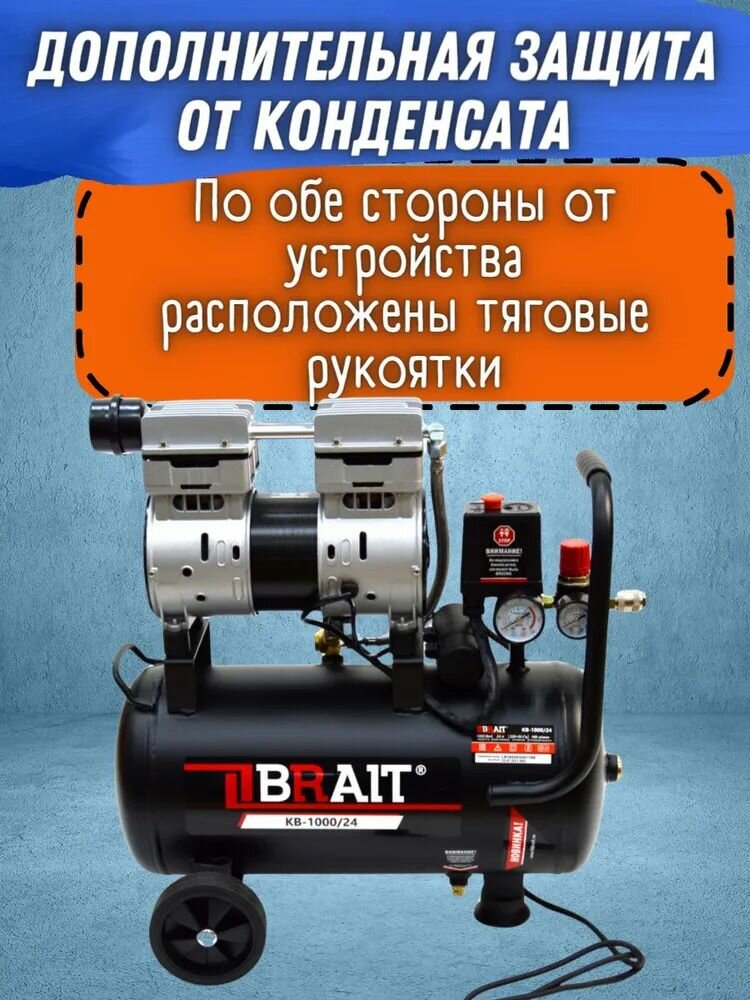 Компрессор воздушный безмасляный поршневой BRAIT KB-1000/24 (24 л, 1 кВт, 8 бар, 180л/м, 2800 об мин) информация: