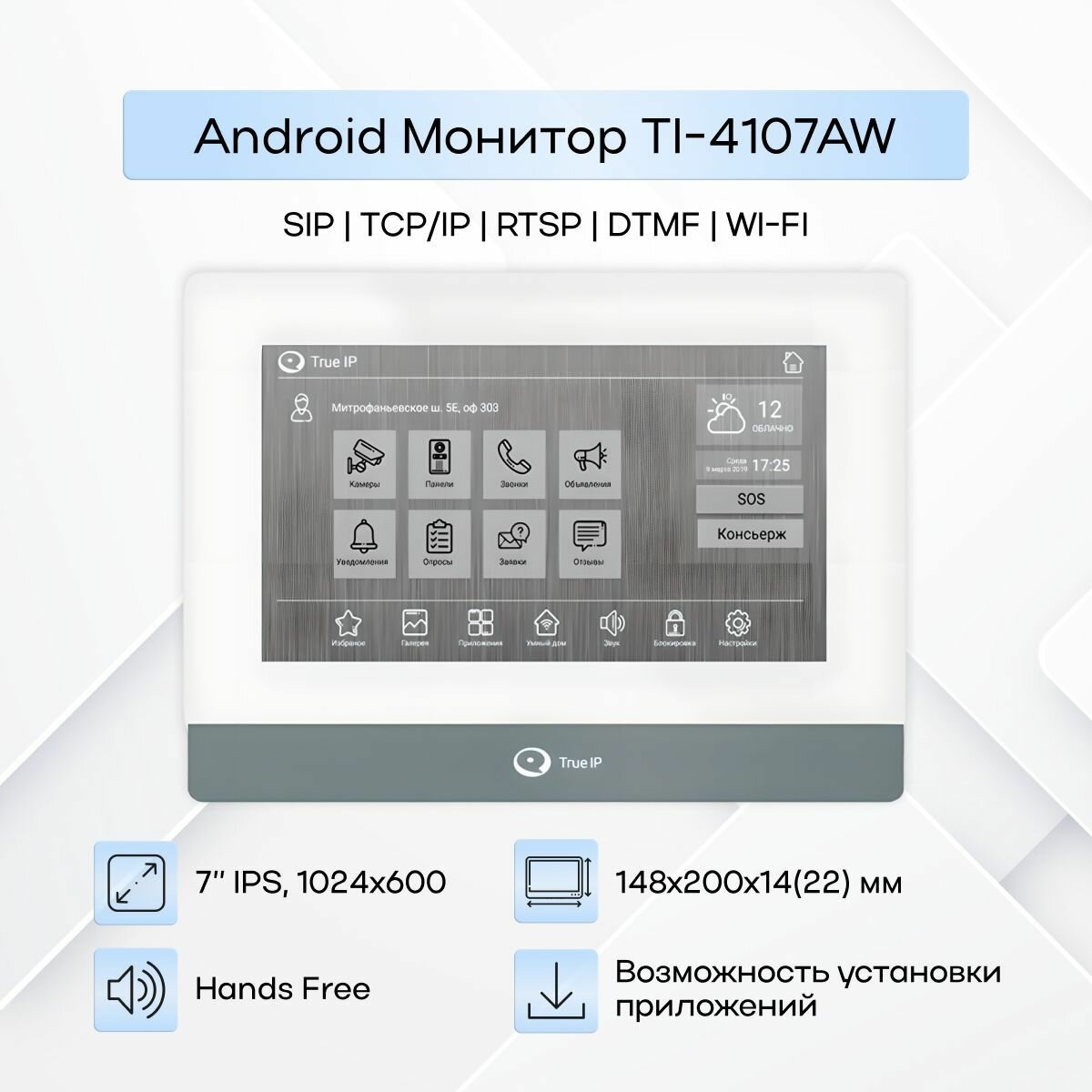 Монитор домофона True IP TI-4107AW, Wi-Fi, Android, цветной экран 7 дюймов информация: