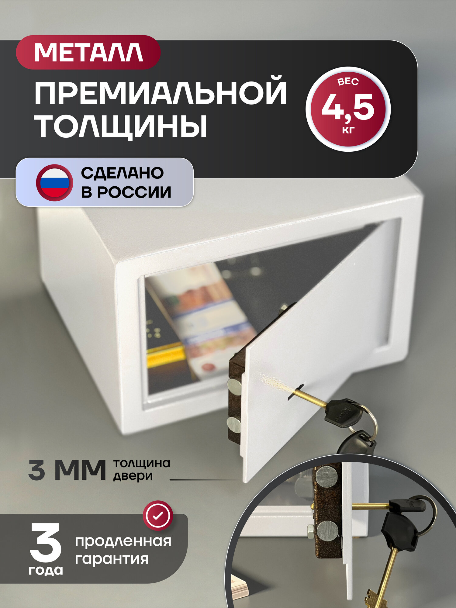 Цельностальной сейф, 3 слоя дополнительного пространства внутри, прочный и долговечный.