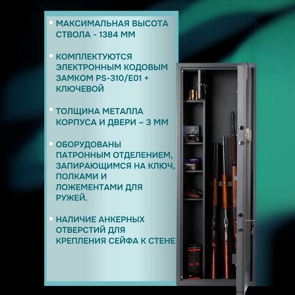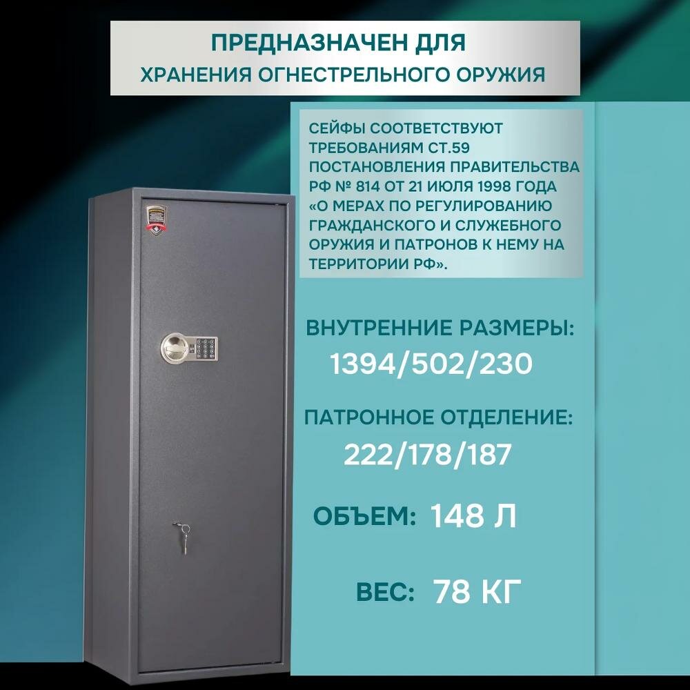 Премиальный оружейный сейф AIKO ФИЛИН 34 EL, электронный + ключевой замок, на 4 ствола высотой до 1384 мм, 140х51х32см информация: