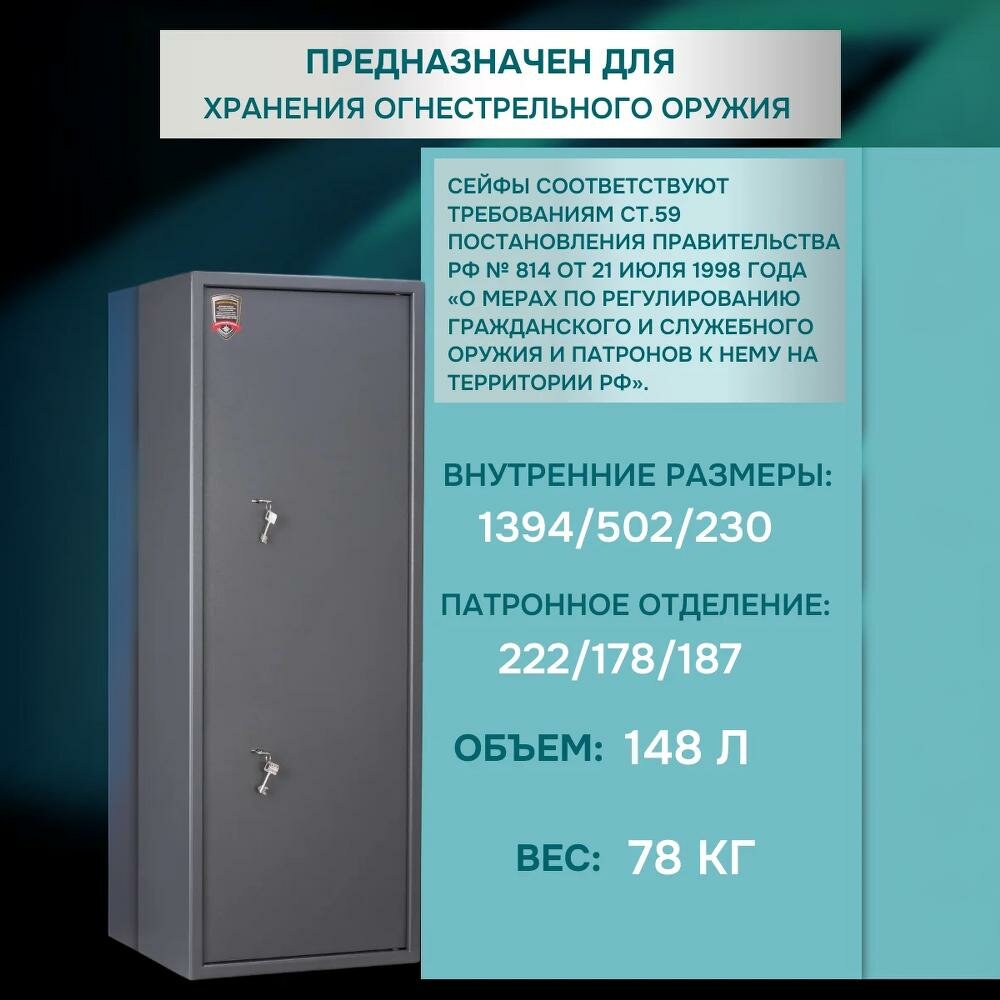 Премиальный оружейный сейф AIKO ФИЛИН 34, ключевой, до 4 стволов, до 1384 мм, с трейзером, 140x51x32см информация: