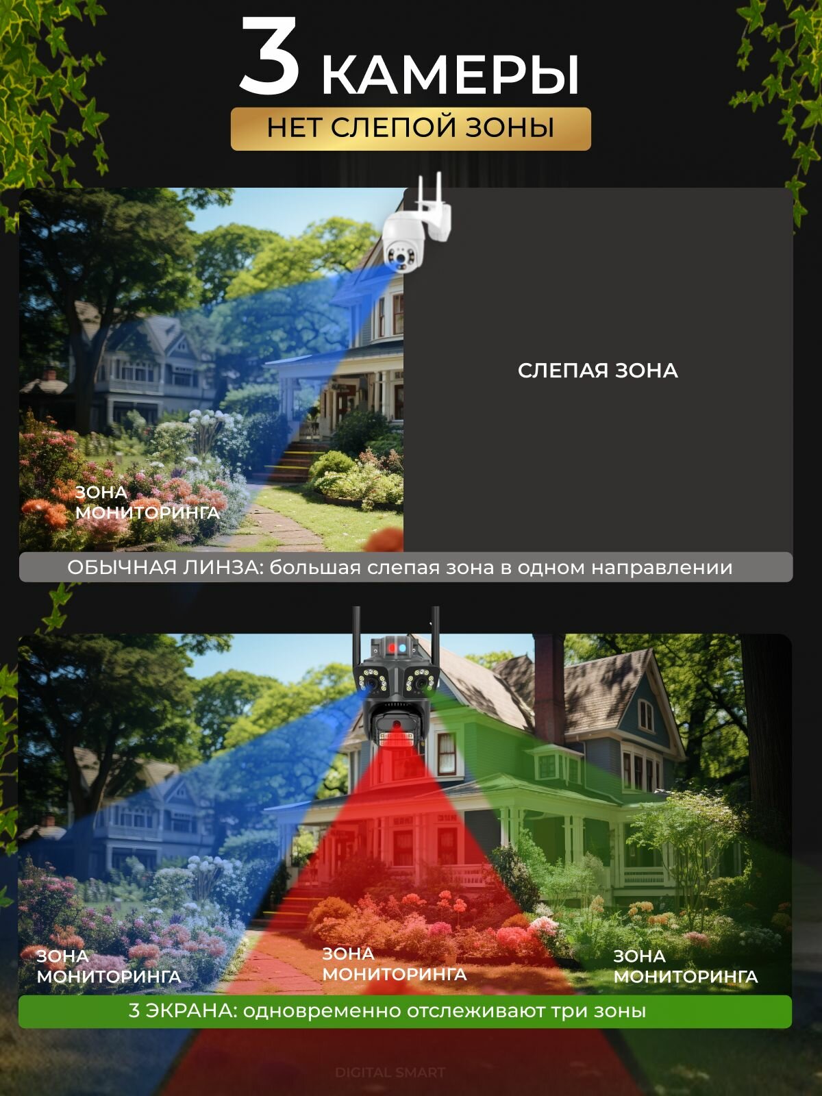 Камера видеонаблюдения уличная WiFi тройная, поворотная, IP видеокамера с датчиком движения, режимом ночной съемки информация: