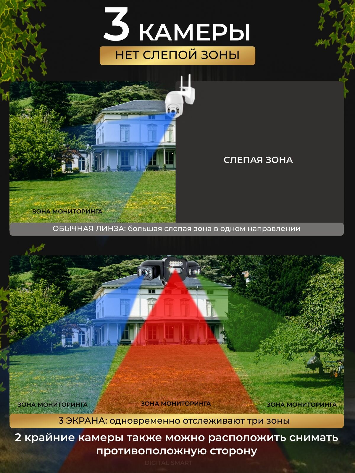 Камера видеонаблюдения уличная WiFi 6Мп тройная, поворотная IP видеокамера с датчиком движения, режимом ночной съемки информация: