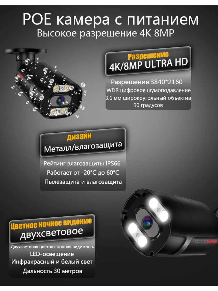 POE 4K комплект видеонаблюдения уличный камера металлическое видеонаблюдение IP66 3TB информация: