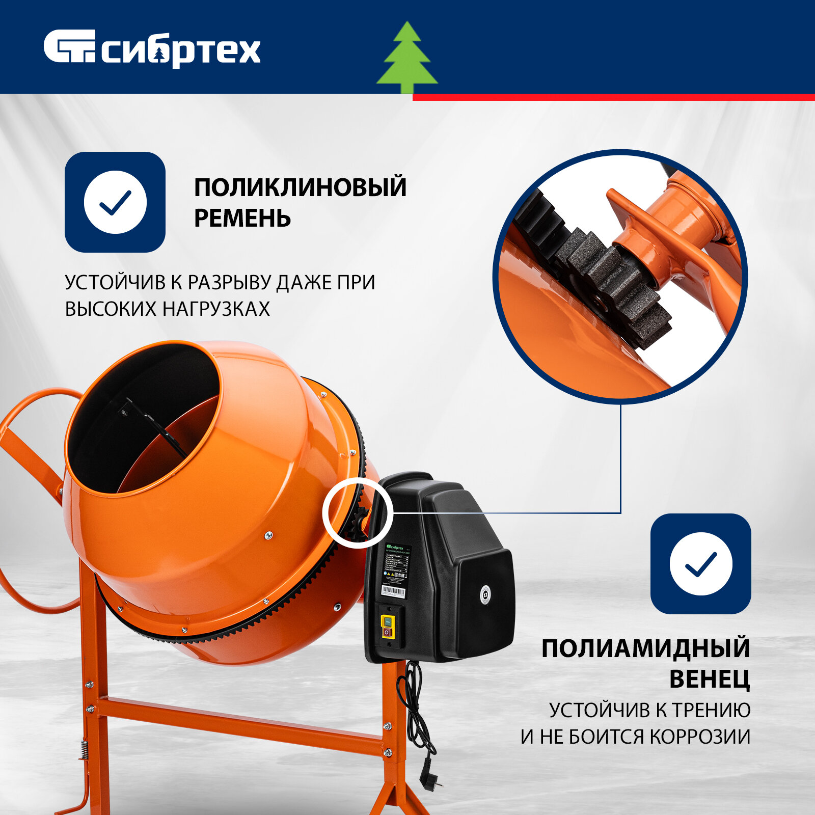 10 цен на Бетономешалка электрическая Сибртех БСН-200П, объем 200 л, 800 Вт, полиамидный венец, 95519