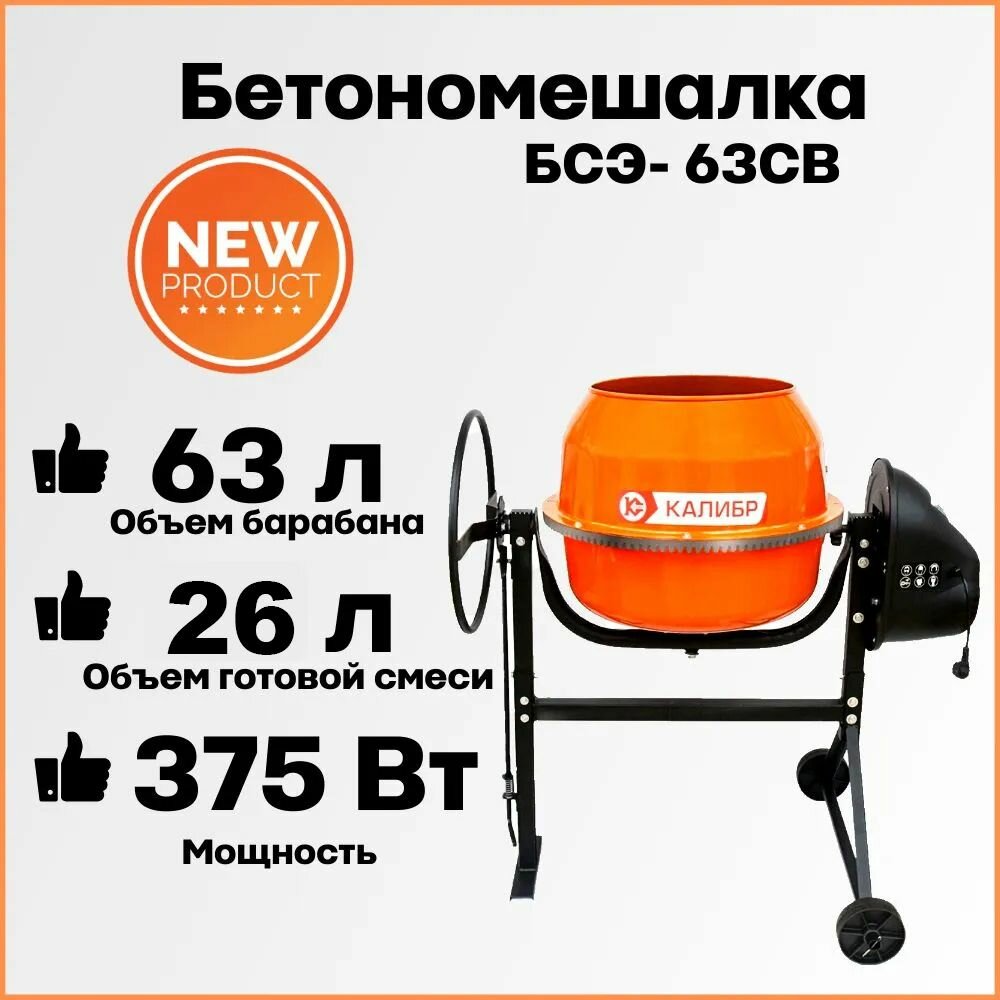 Бетономешалка строительная Калибр БСЭ- 63СВ сегментный венец из алюминиевого сплава, объем 63 литров, мощность 375 Вт, бетоносмеситель электрический информация: