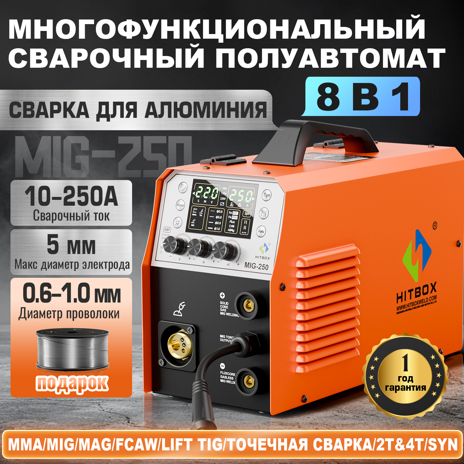 10 цен на Сварочный полуавтомат без газа, с газом HITBOX MIG250 8 в 1(ММА/MIG/MAG/FCAW/LIFT TIG/ТОЧЕЧНАЯ СВАРКА/2T/4T)