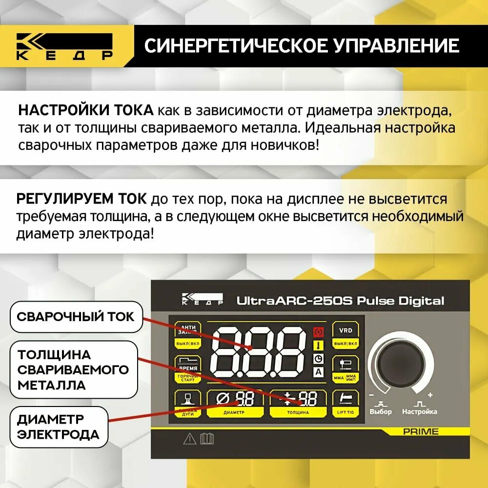 10 цен на Аппарат сварочный инверторный кедр UltraARC-250S Pulse Digital (230В, 20-220А) Импульсный режим, LCD дисплей, Синергетическое управление 8027929