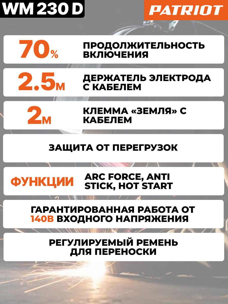 Сварочный инвертор PATRIOT 230D, MMA, антиприлипание/горячий старт/форсаж дуги информация: