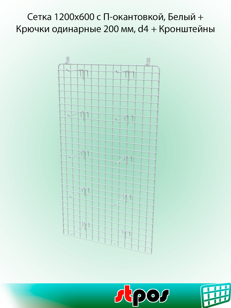 КОМПЛЕКТ Сетка 1200х600 с П-образной окантовкой, Белый+Крючки одинарные 200мм, d4, шаг 50мм, Белый - 10 шт+Кронштейны информация:
