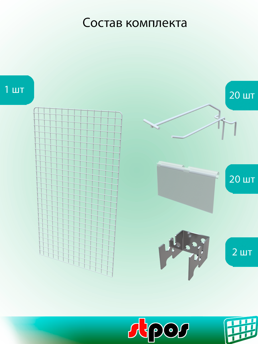 КОМПЛЕКТ Сетка 1200х600, Белый+Крючки одинарные 150 мм, d4/d4, шаг 50мм, Белый - 20 шт+Ц/д LH39х70-20шт+Скобы SLN информация: