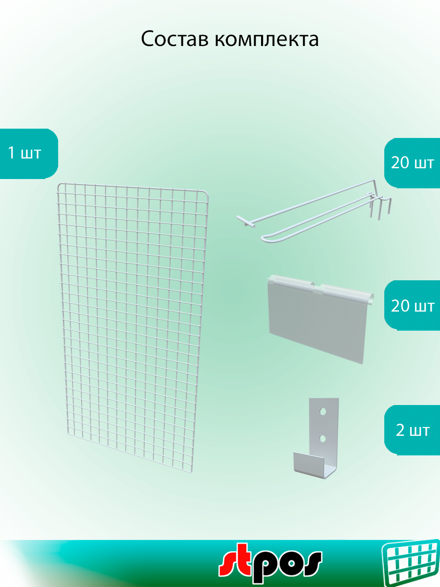 10 цен на КОМПЛЕКТ Сетка 1200х600, Белый+Крючки двойные 275 мм, d4/d4, шаг 50мм, Белый - 20 шт+Ц/д LH39х70 - 20 шт+Кронштейны