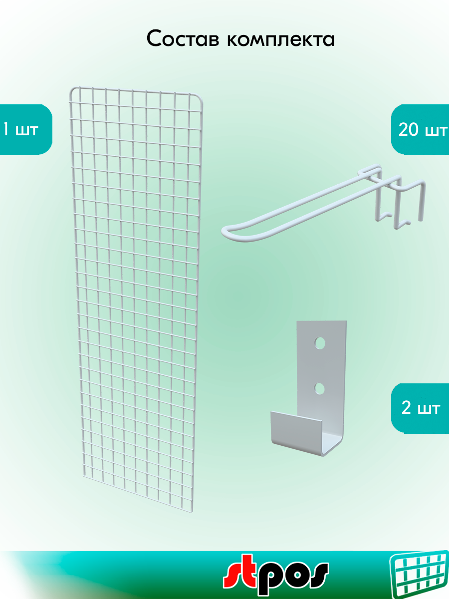 Отзывы на КОМПЛЕКТ Сетка 1200х350мм с П-окантовкой, Белый+Крючки двойные с зацепом 175мм d4, шаг 50мм, Белый 20 шт+Кронштейн