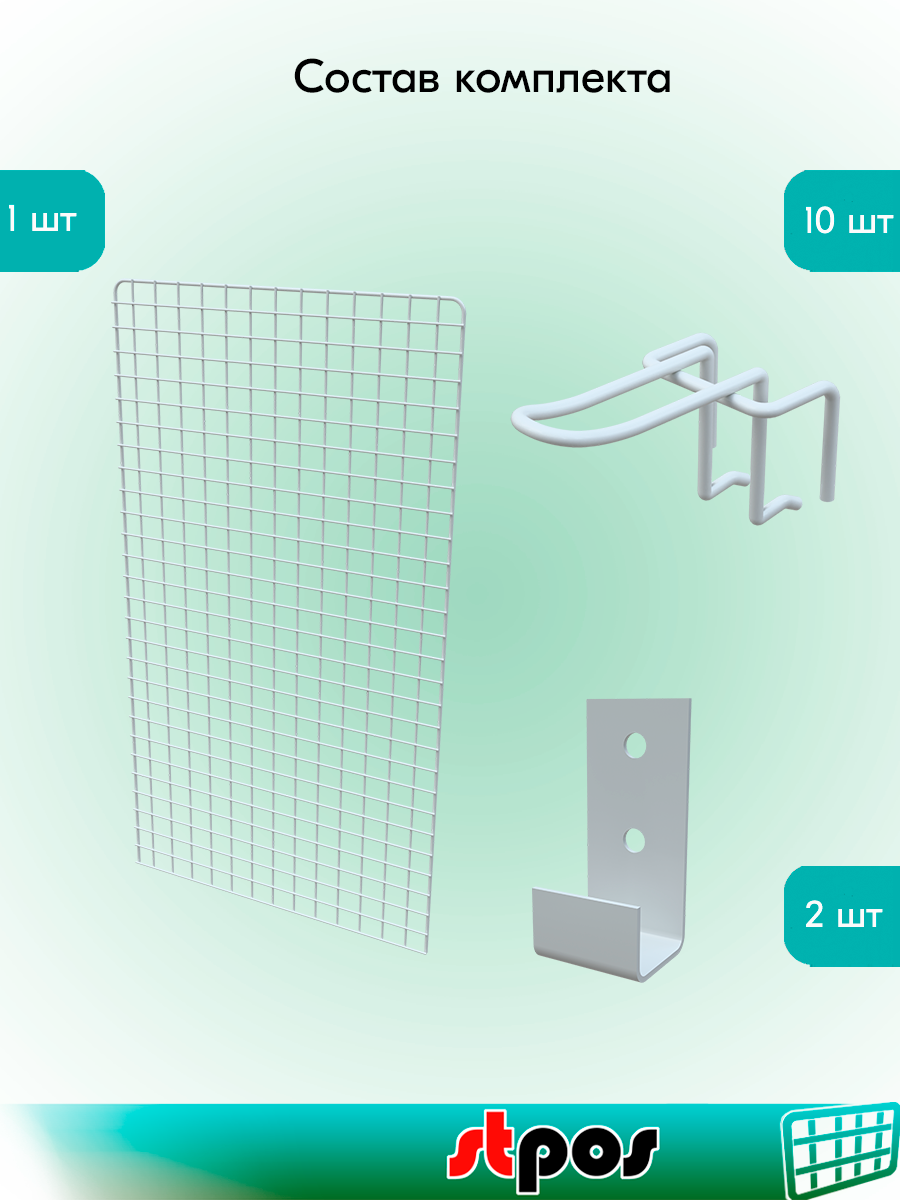 Отзывы на КОМПЛЕКТ Сетка 1200х600 с П-окантовкой, RAL9016, Белый + Крючки двойные с зацепом 75мм, d4, шаг 50мм-10 шт + Кронштейн
