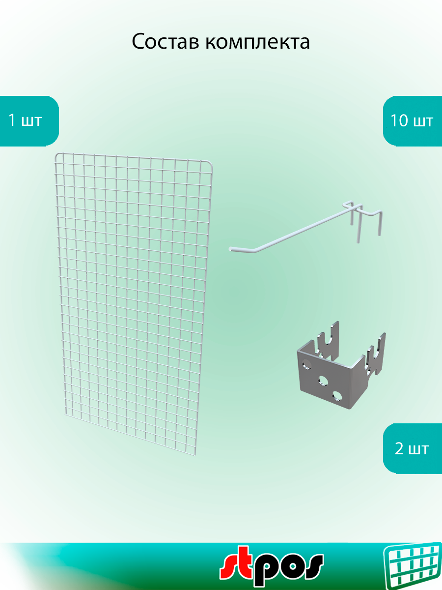 КОМПЛЕКТ Сетка 1200х600, Белый + Крючки на решетку одинарные 200 мм, d4, шаг 50мм, Белый - 10 шт + Скобы SLN информация: