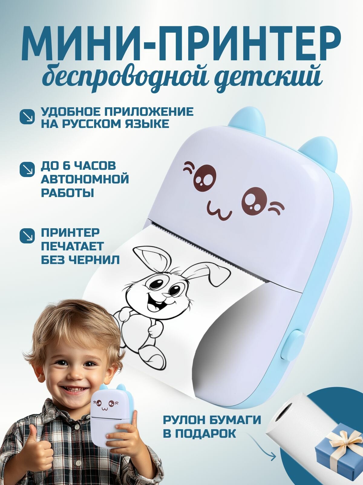 Беспроводной детский портативный мини-термопринтер для телефона / Принтер для наклеек, синий информация: