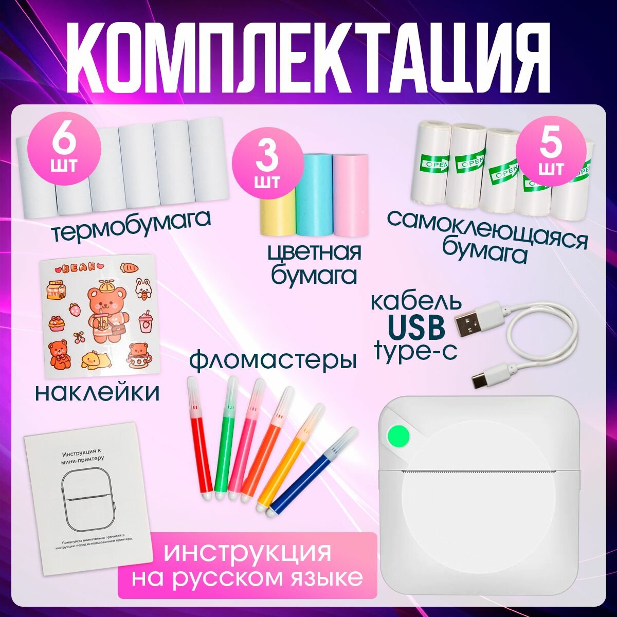 Мини принтер для телефона, беспроводной портативный термопринтер для печати фотографий, наклеек, стикеров, с бумагой в комплекте информация: