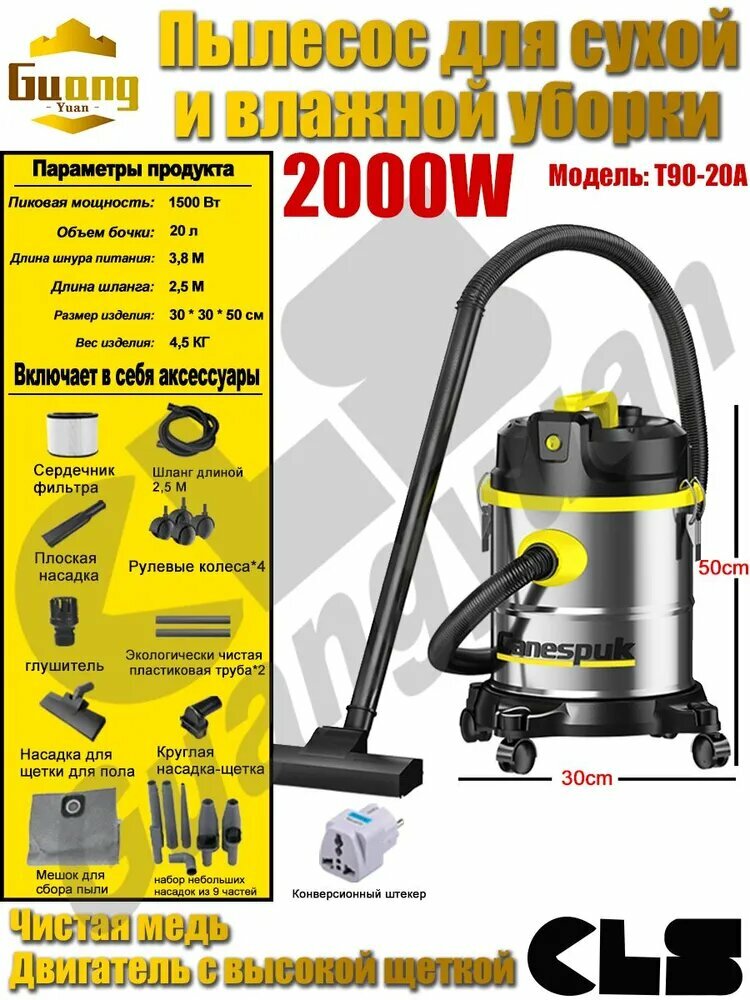 10 цен на Строительный пылесос, 20л, 2000Вт, сухая/влажная уборка, черный матовый