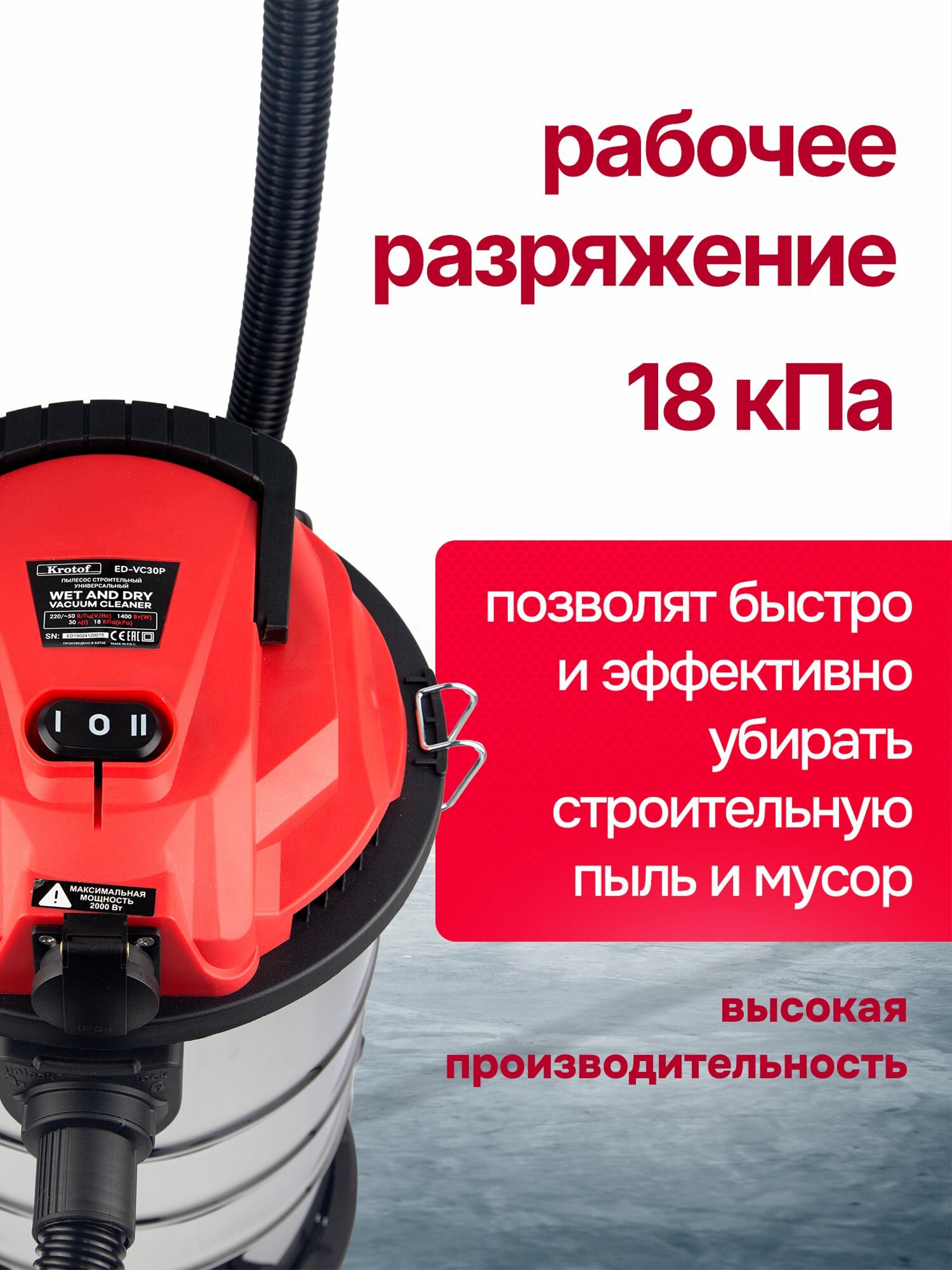 Пылесос строительный Krotof KVC30P, 30 литров, с синхронным включением электроинструмента, промышленный электрический информация: