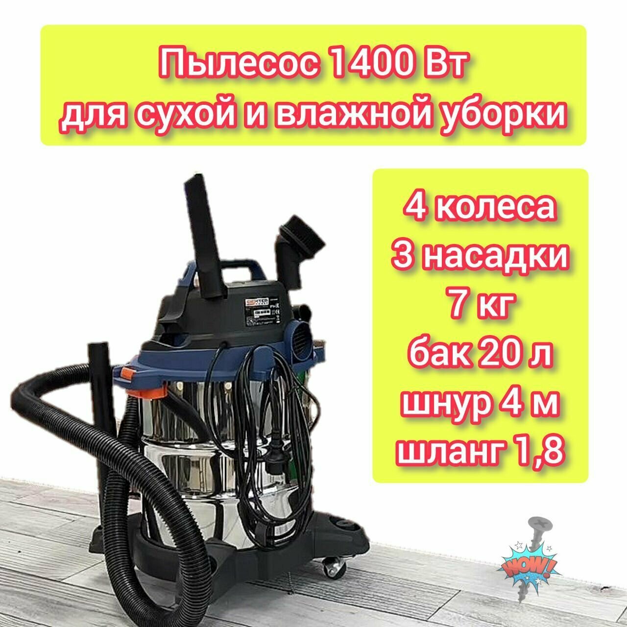 Пылесос строительный для влажной и сухой уборки, 1400 Вт, 20 л, шнур 4 метра информация: