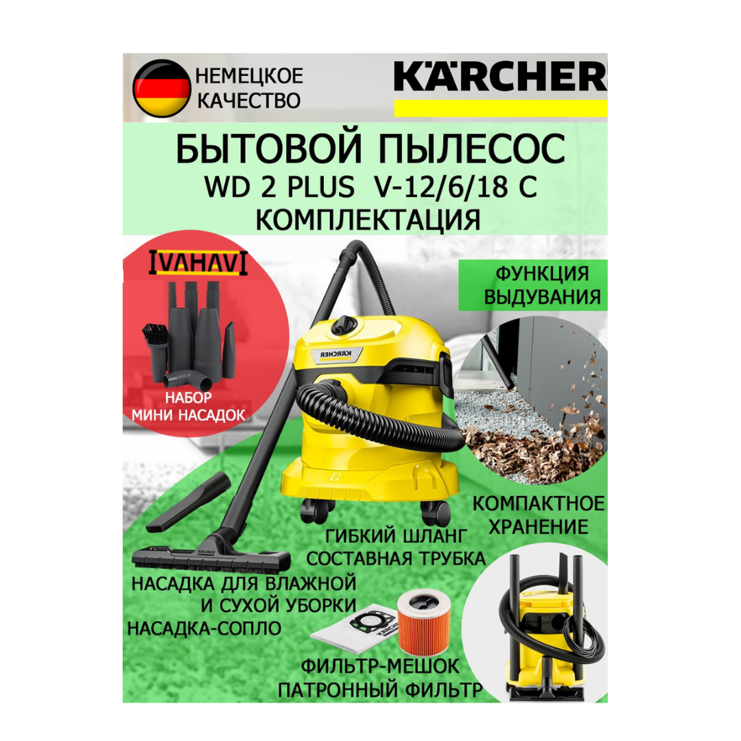 10 цен на Хозяйственный пылесос Karcher WD 2 Plus V-12/6/18/C+набор мини-насадок для труднодоступных мест и ПК