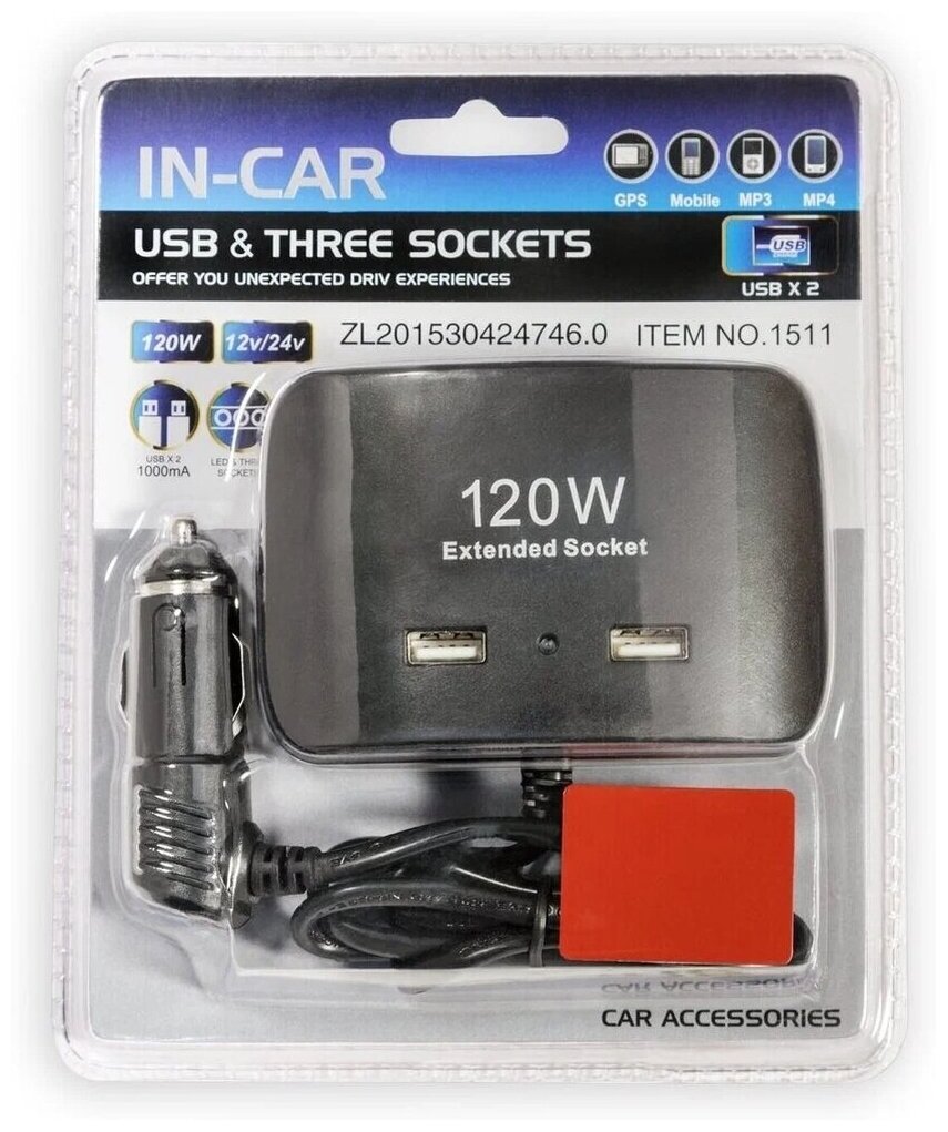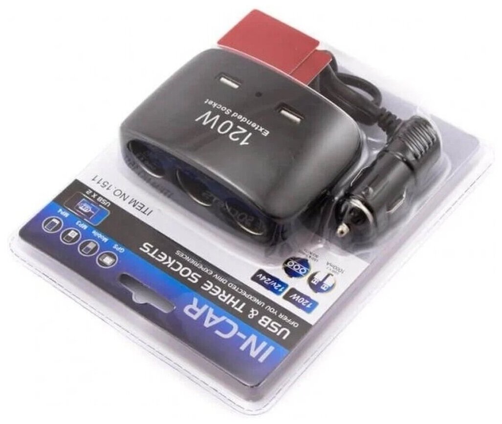 Разветвитель авто Olesson NO.1511 (2USB /3Sockets) (черный)