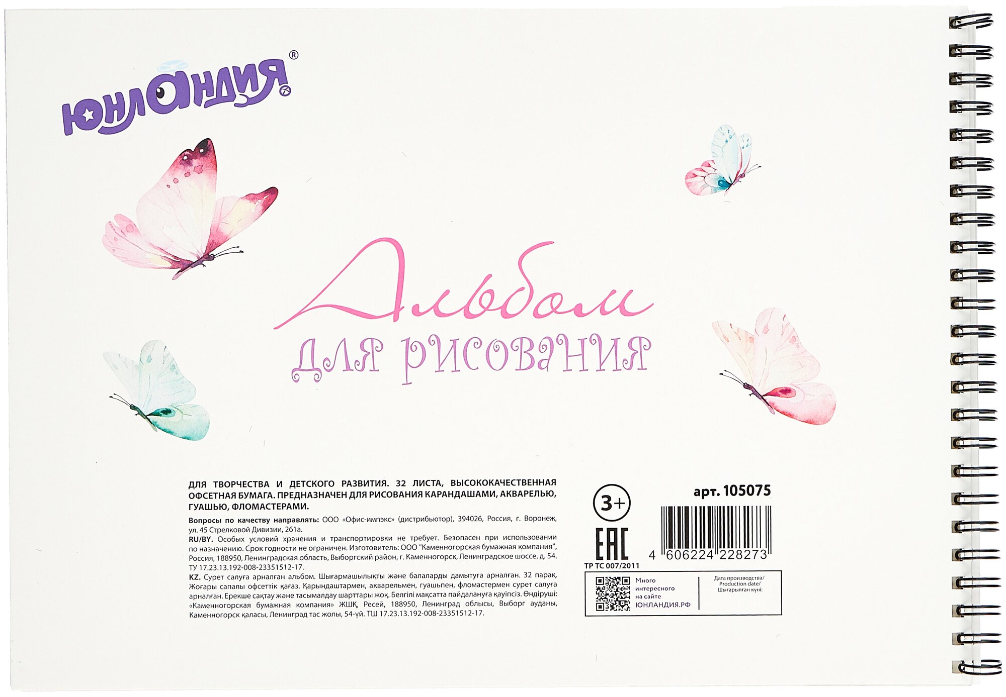 Альбом для рисования, А4, 32 листа, гребень, обложка картон, юнландия, 205х290 мм, "Цветочный сад" (1 вид), 105075 информация:
