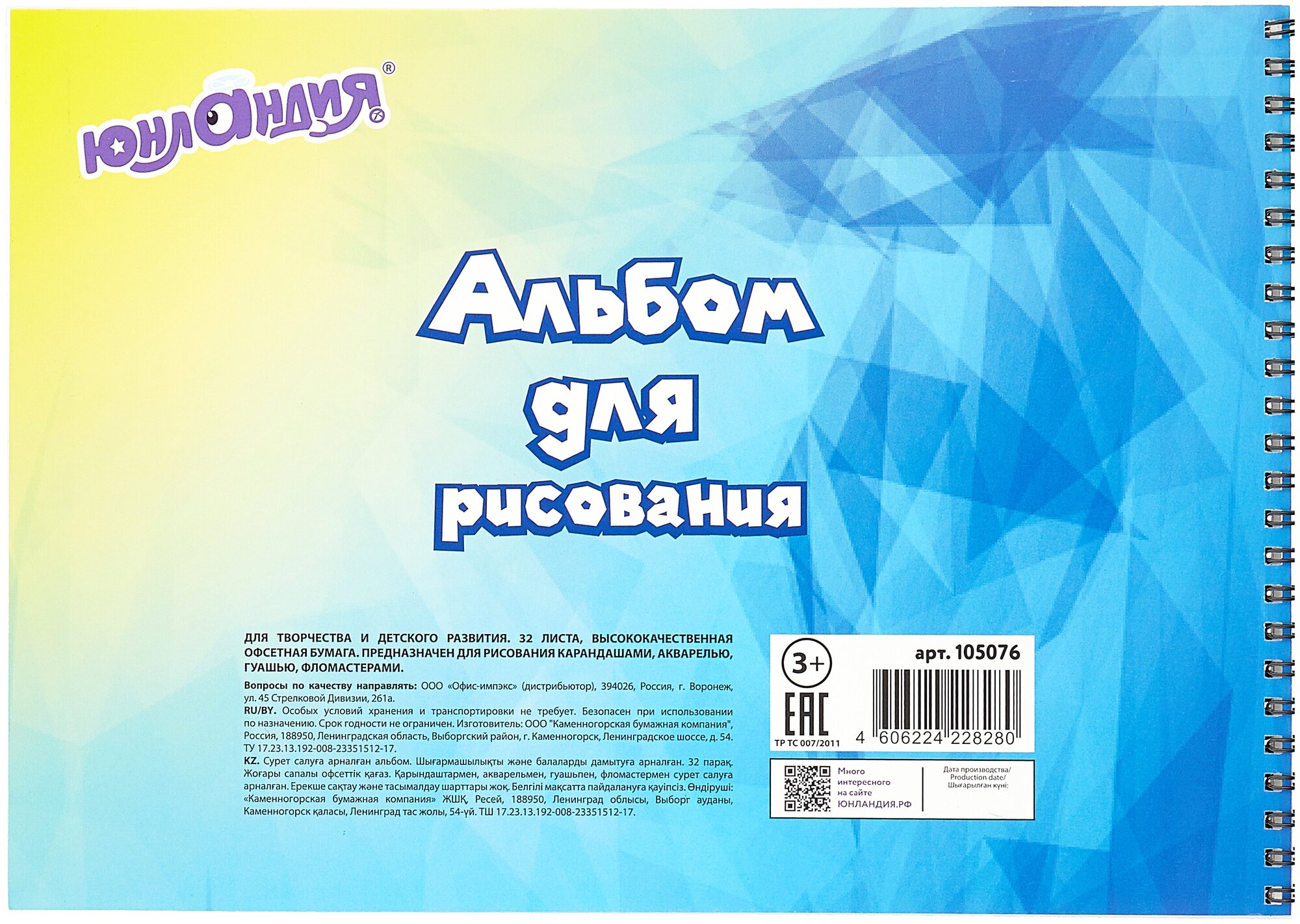 Альбом для рисования, А4, 32 листа, гребень, обложка картон, юнландия, 205х290 мм, "Футбол" (1 вид), 105076 информация: