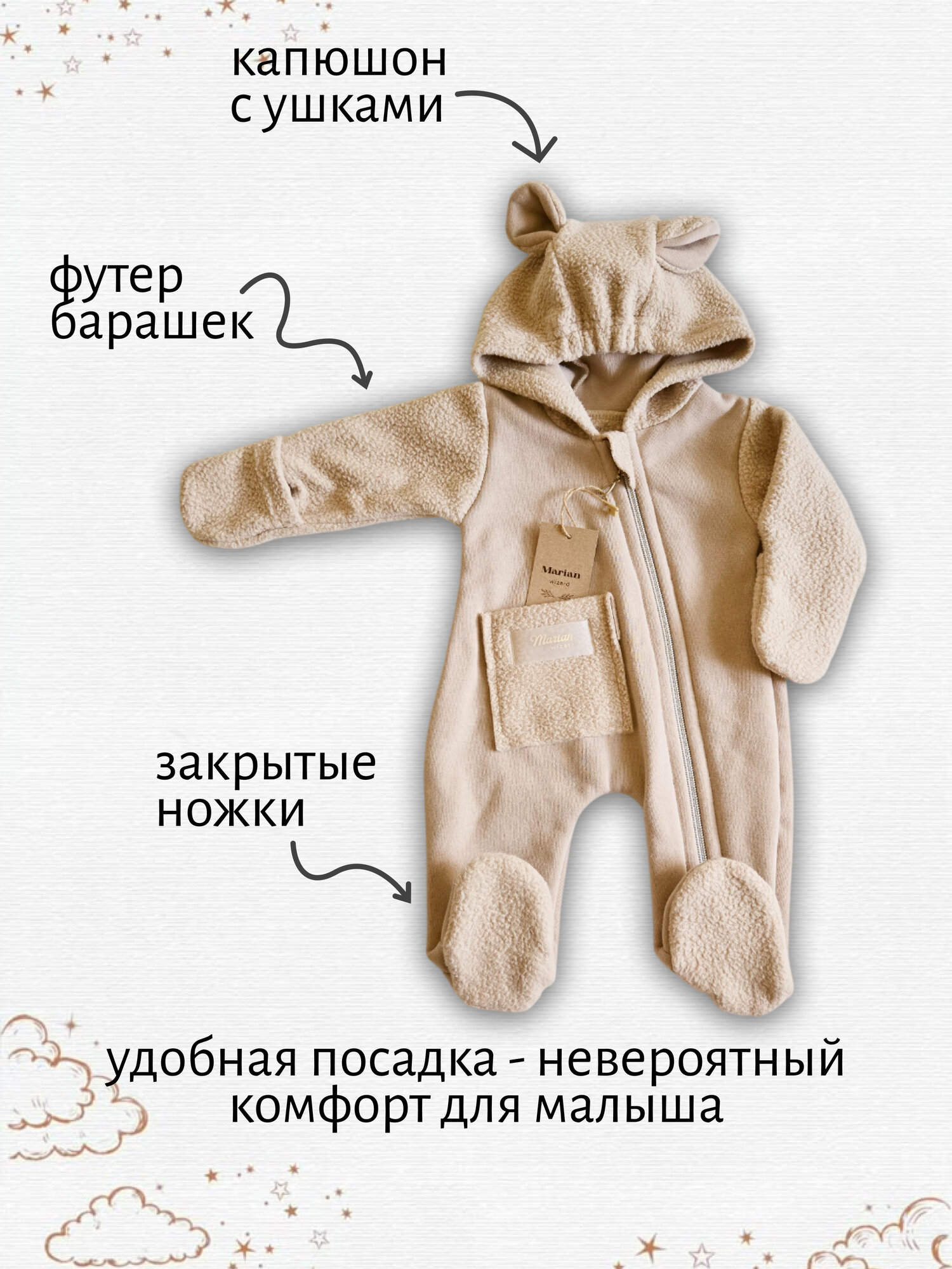 Комбинезон Marianwizard теплый из футера для новорожденных с закрытыми ножками и регулируемыми ручками, размер 68, бежевый информация: