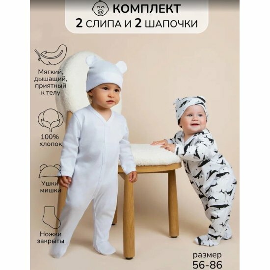 Комбинезон Amarobaby Nature, закрытая стопа, комплект из 2 шт., размер 80-86, белый 1 768 ₽