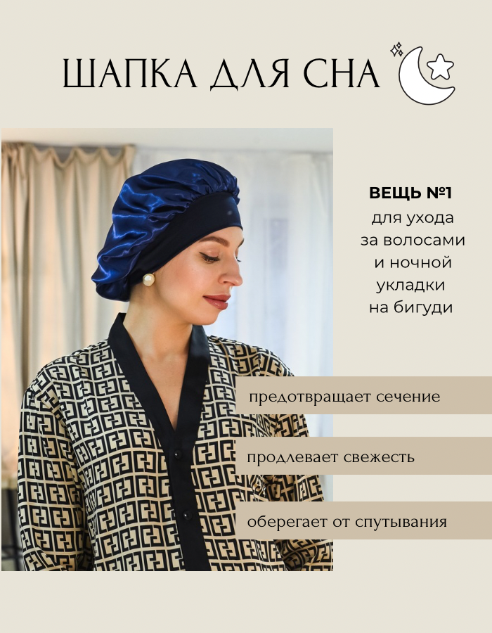 Шапочка для сна WMA STORE, атласная, шелковая, синяя, с эластичной лентой, женская, 52-60 информация:
