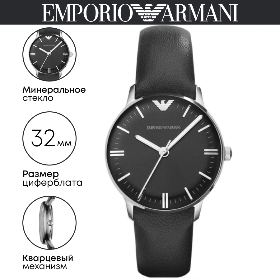 Часы наручные женские Emporio Armani AR11598 кварцевые на кожаном браслете черного цвета с минеральным стеклом водонепроницаемостью WR50 (5 атм)