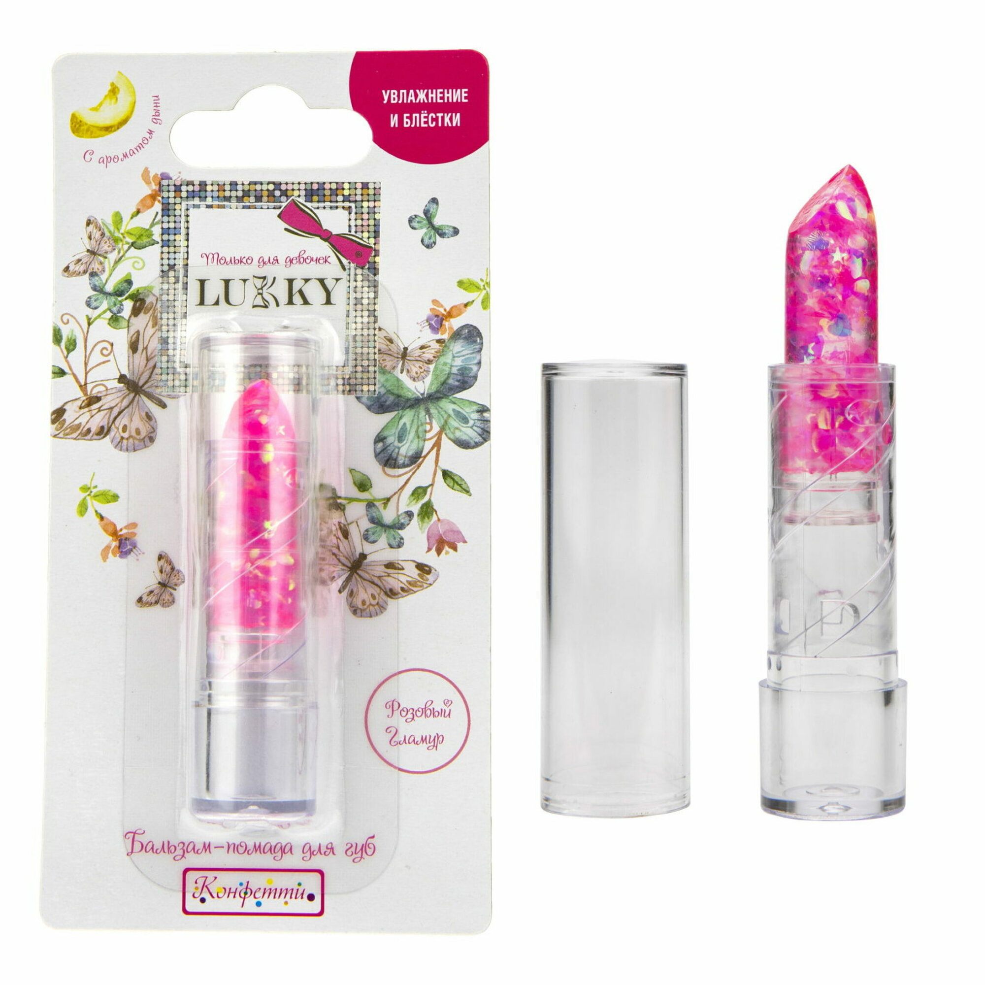 Бальзам-помада для губ Lukky "Конфетти" прозрачн. с розов. блестками с ароматом дыни,3,3 г информация:
