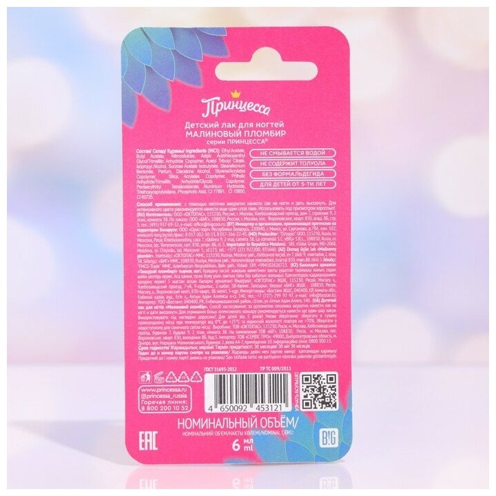 Лак для ногтей "Принцесса Малиновый Пломбир", гипоаллергенный, без ацетона, 6мл информация: