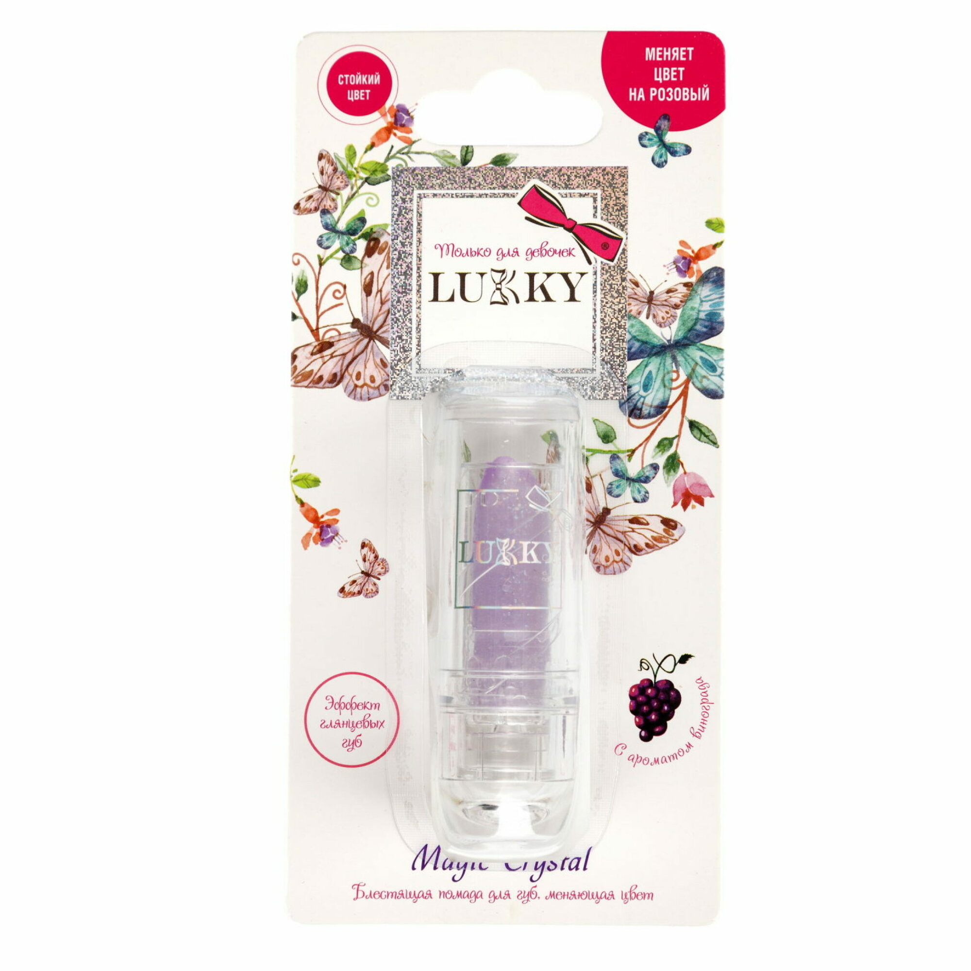 10 цен на Блестящая помада Lukky Magic Crystal меняющая цвет на розовый, цвет фиолетовый с блестками, с ароматом винограда, 3,4 гр