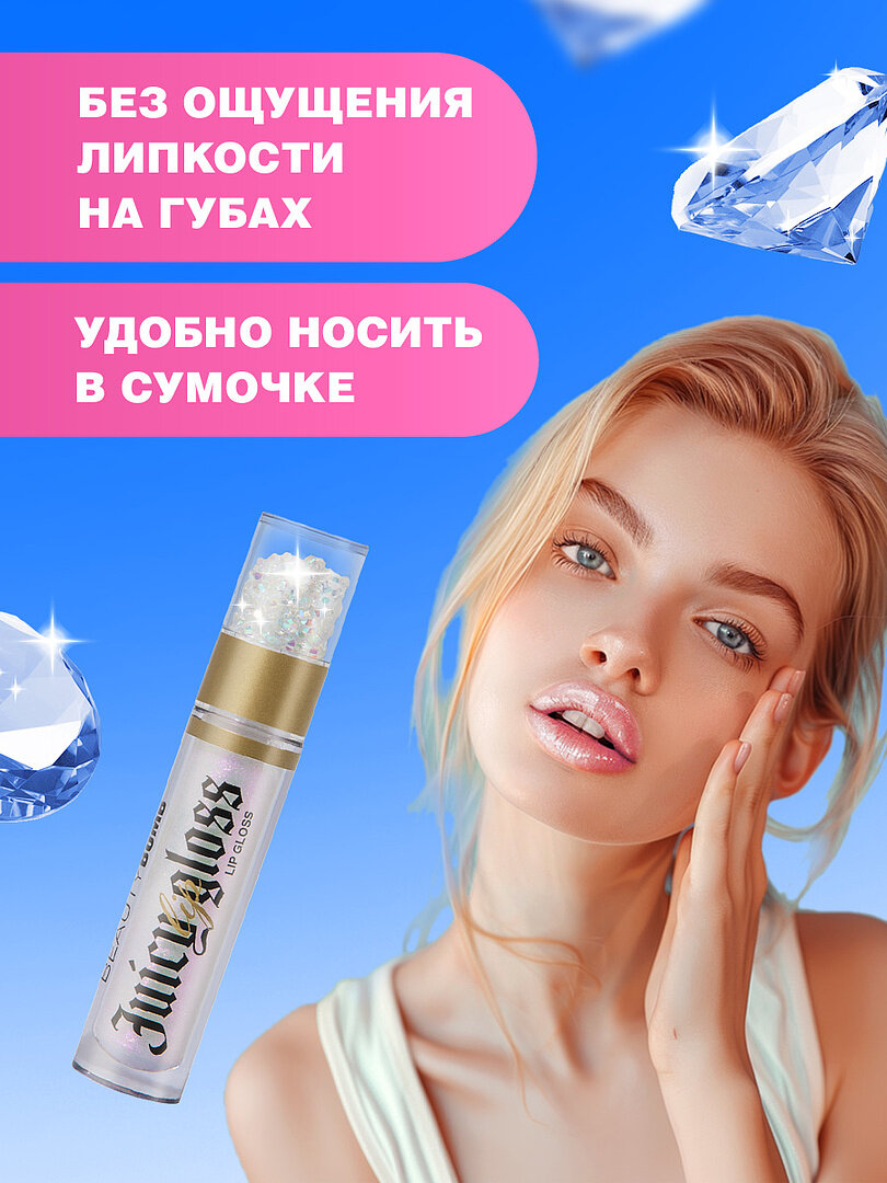 10 цен на Блеск для губ Juicy Beauty Bomb смягчающий тон 01 Diamond Star прозрачный с нежно-розовыми блестками