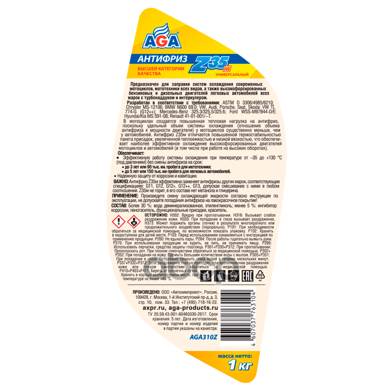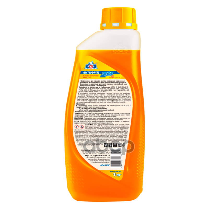 10 цен на Антифриз, Готовый К Применению, Оранжевый, -35С, 1Кг, G-12++ Antifreeze Aga-Z35m, Premix AGA арт. AGA310Z