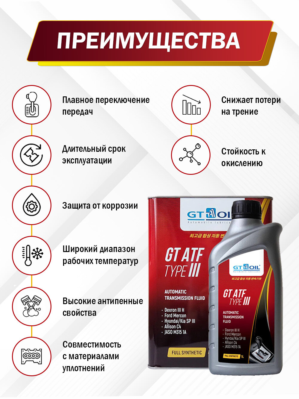 Масло трансмиссионное для АКПП, ГУР GT ATF TYPE III, синтетическое, 4 л информация: