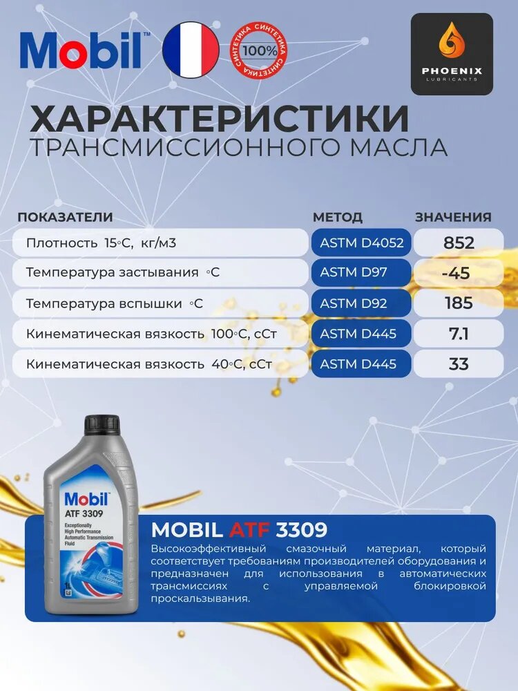 Масло трансмиссионное MOBIL "ATF 3309", для автоматических трансмиссий, минеральное, 1л информация: