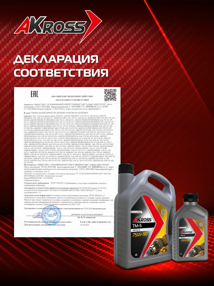 AKross TM-5 75W-90 Масло трансмиссионное полусинтетическое, API GL-5, 4 литра информация: