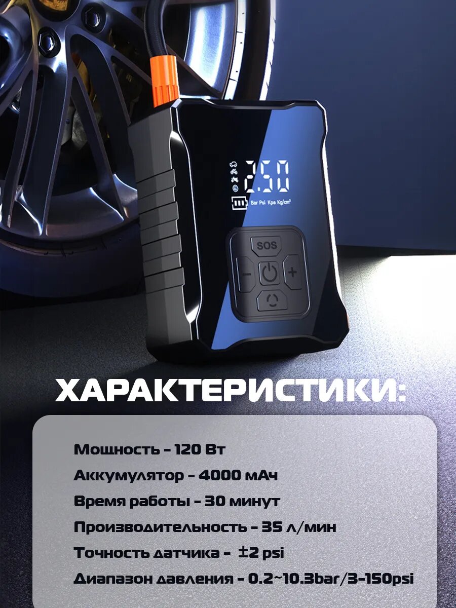 Компрессор автомобильный, воздушный, электрический для накачки шин, беспроводной информация:
