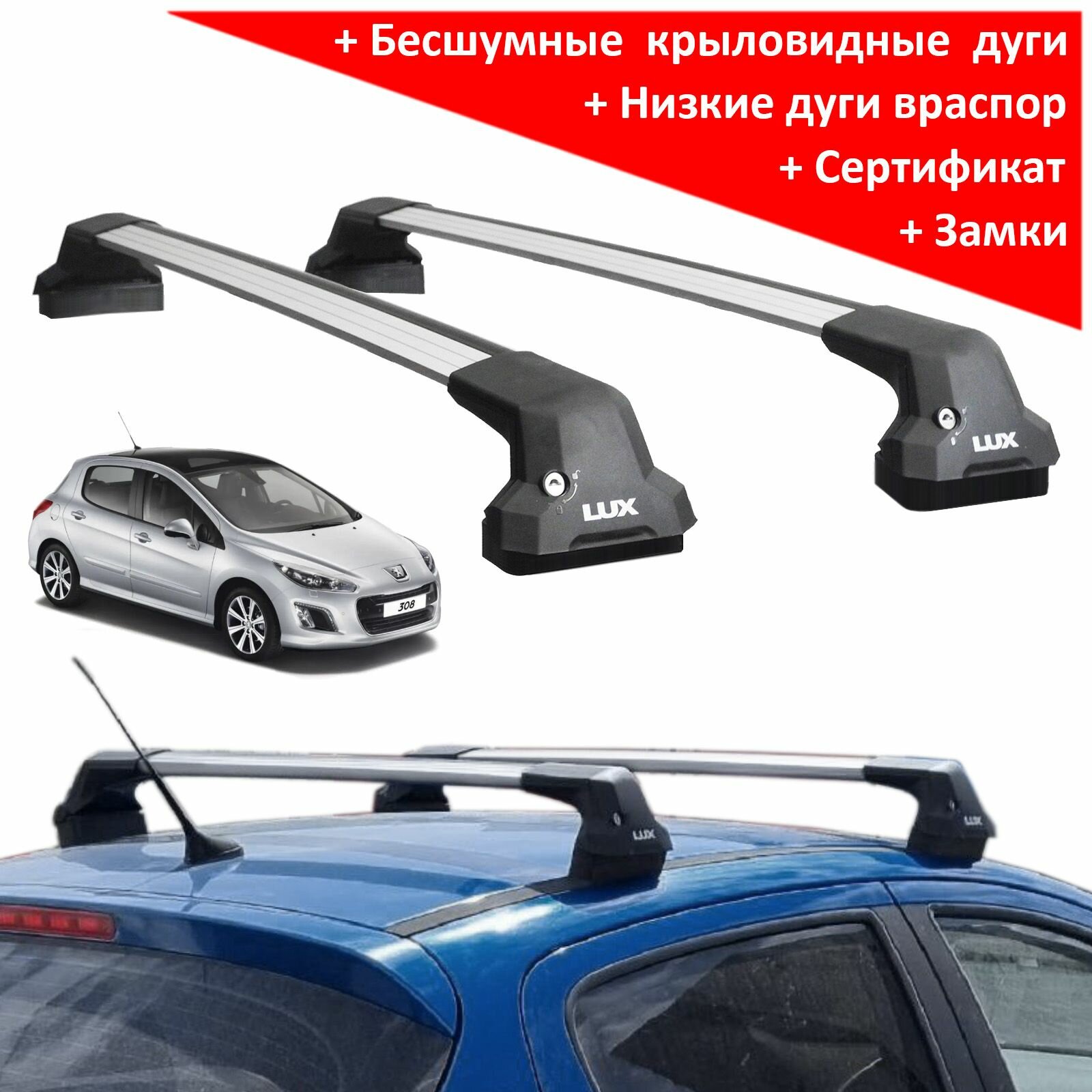 Багажник на крышу Пежо 308, хэтчбек (Peugeot 308, 2008-2021), Lux City, с замком, серебристые крыловидные дуги информация: