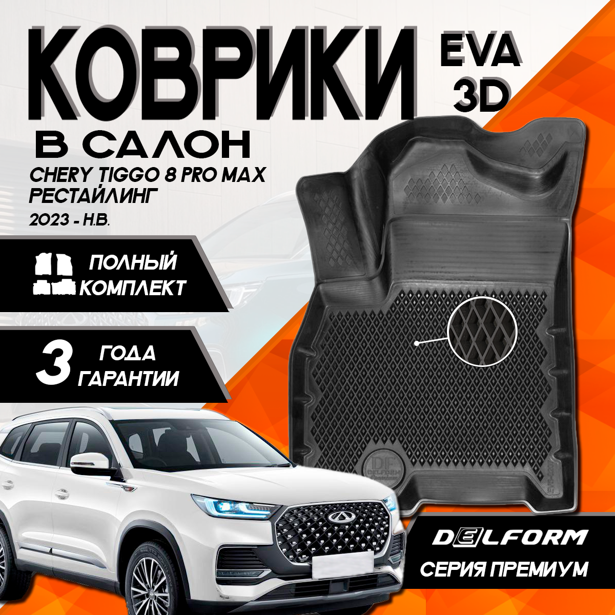 10 цен на Ева коврики c бортами Чери Тигго 8Про Макс рестайлинг (2023-) /Chery Tiggo 8Pro Max (2023-) DELFORM 3D Premium cалон