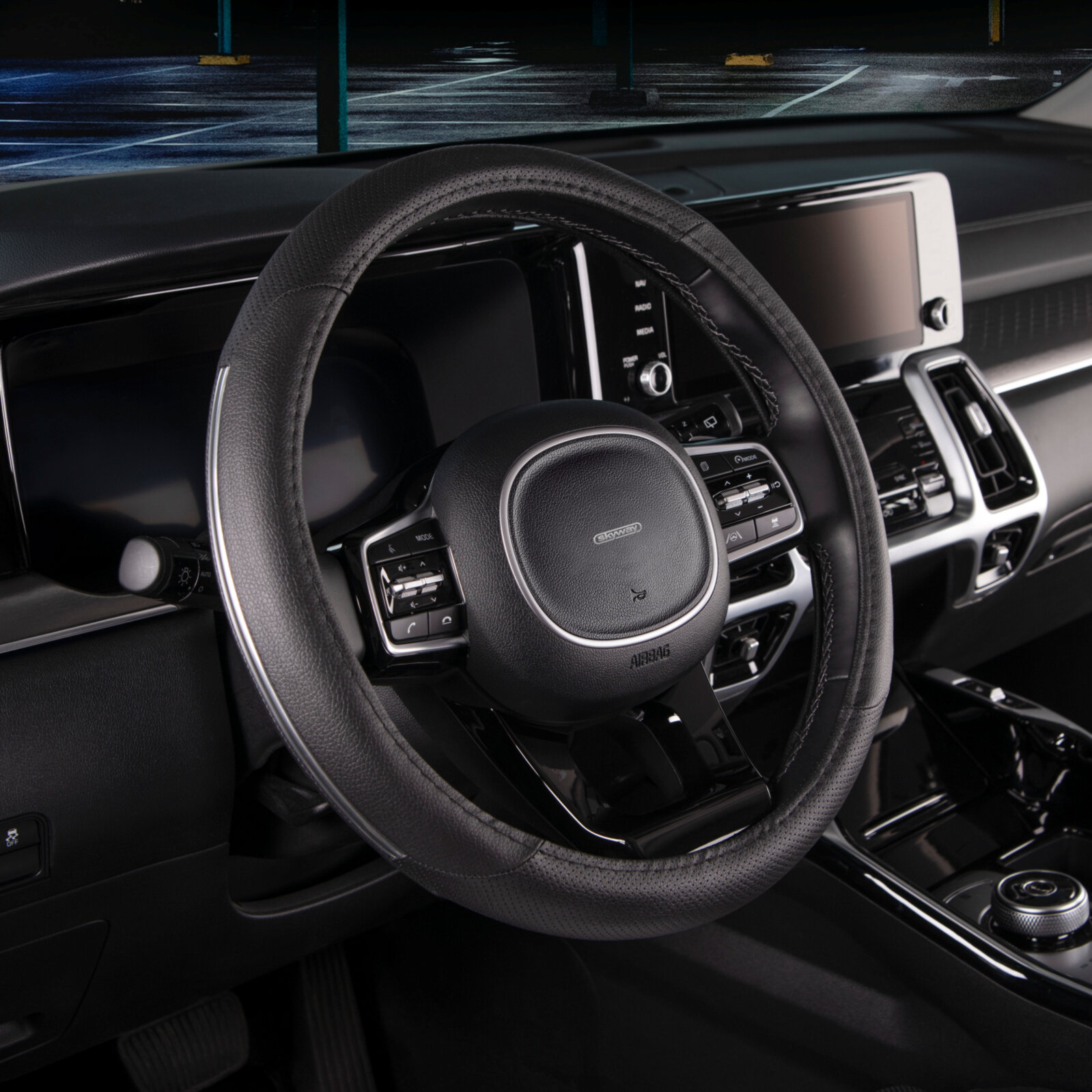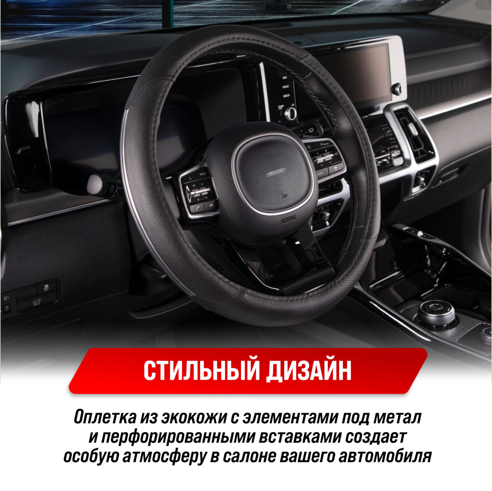 Оплётка руля CAR PERFORMANCE CP-2050 BK/BK (L), экокожа, две 3D вставки под хват, гладкая основа с перфорированной контрастной вставкой чёрый, разм. L,